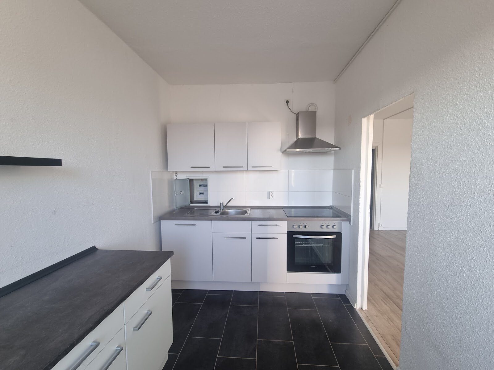 - Anthrazite Boden- und weiße Wandfliesen in der Küche