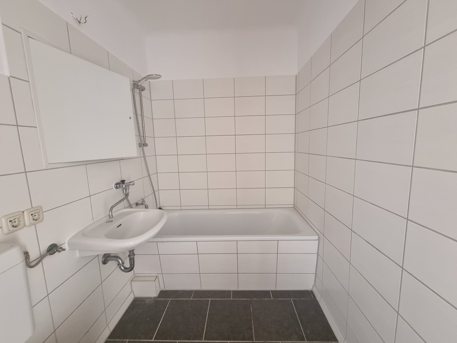 - Anthrazite Boden- und weiße Wandfliesen im Bad