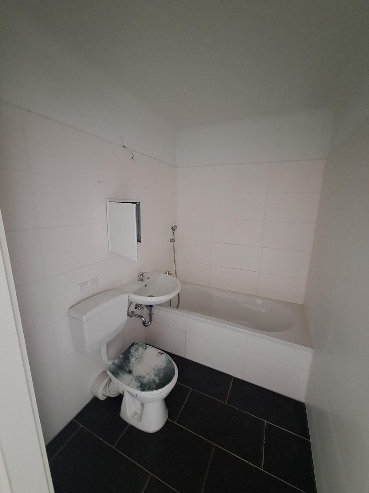 - Anthrazite Boden- und weiße Wandfliesen im Bad