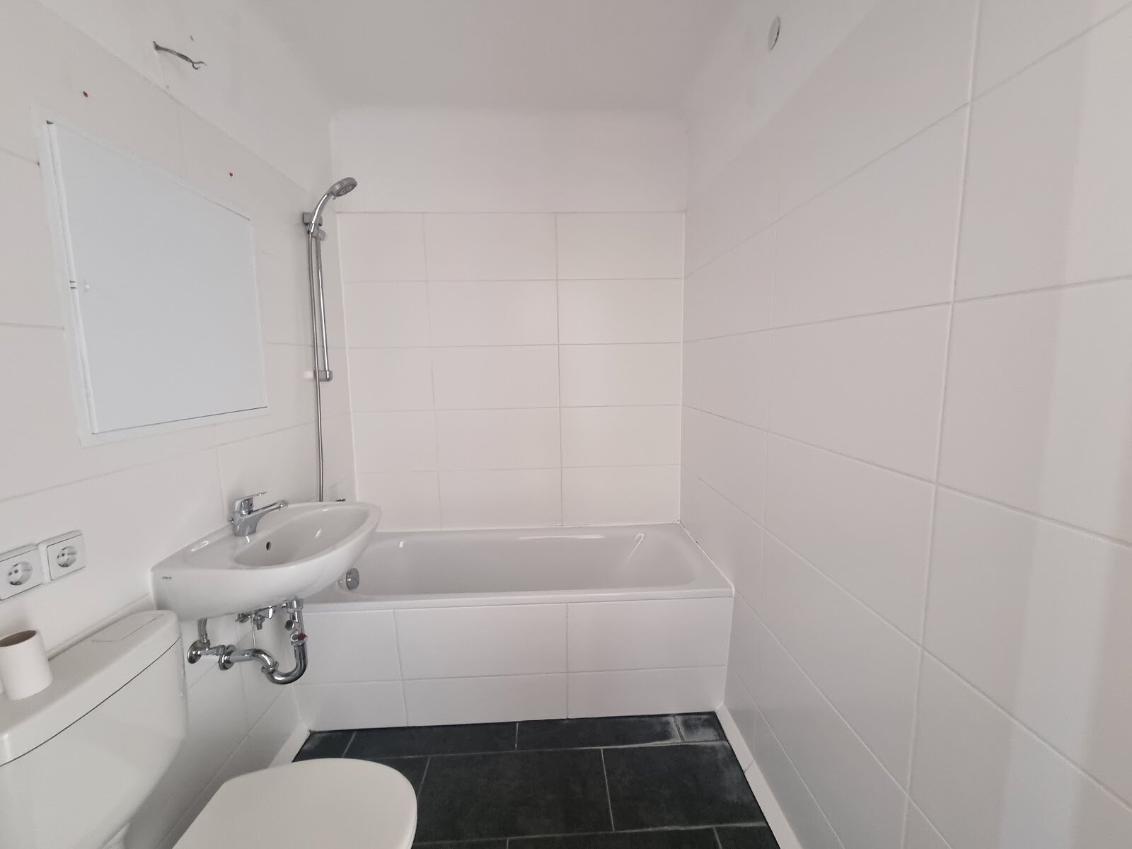 - Anthrazite Boden- und weiße Wandfliesen im Bad