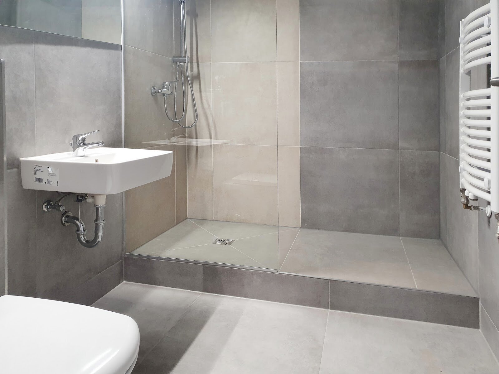 - Anthrazite Boden- und weiße Wandfliesen im Bad