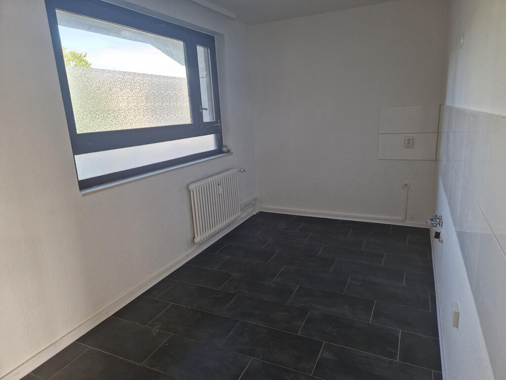 - Anthrazite Boden- und weiße Wandfliesen in der Küche