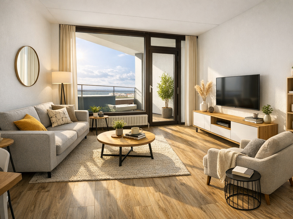 - Die in der Anzeige verwendeten Fotos können Beispielfotos oder KI-generierte Visualisierungen (Kennzeichnung mit „virtually staged“) sein, die der besseren Veranschaulichung der Immobilie dienen und von den tatsächlichen Gegebenheiten abweichen können.