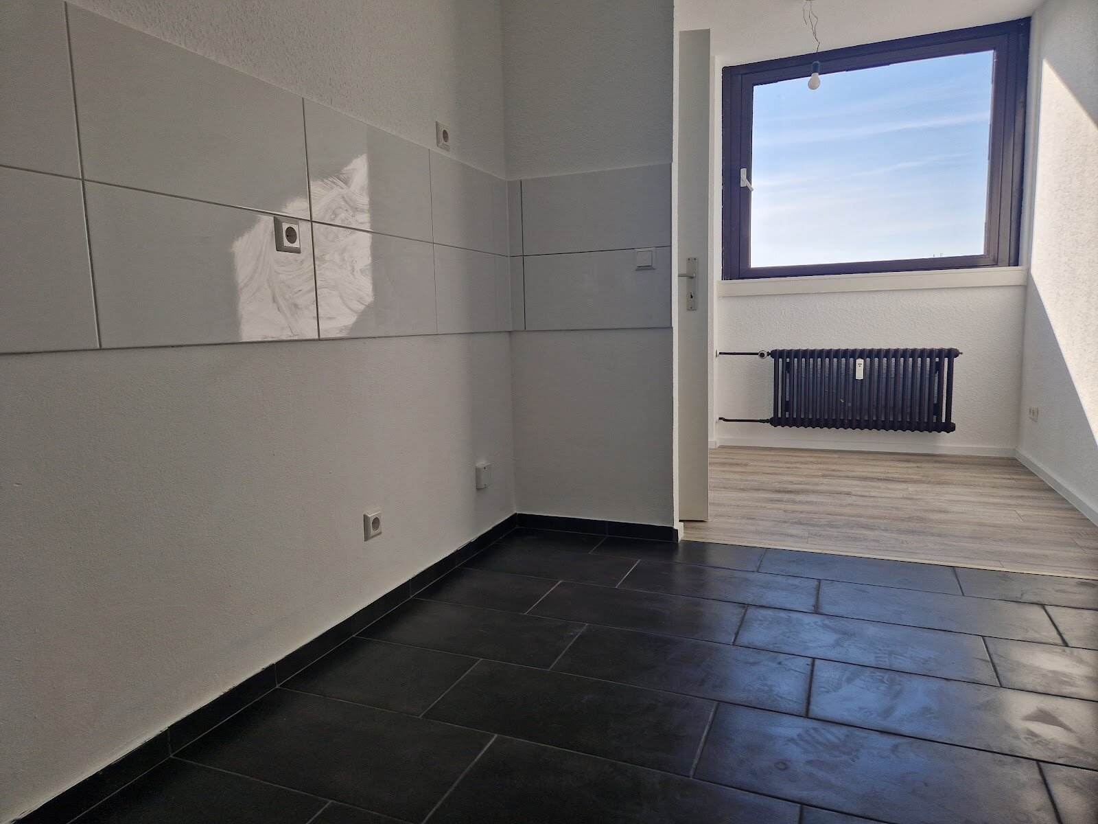- Anthrazite Boden- und weiße Wandfliesen in der Küche
