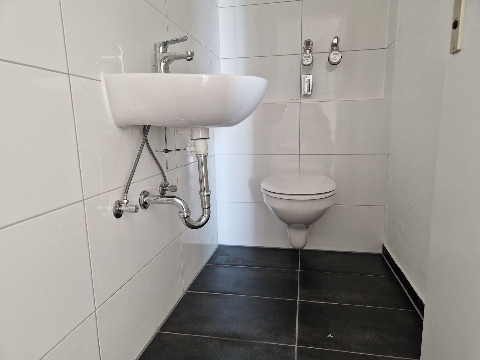 - Anthrazite Boden- und weiße Wandfliesen im Bad