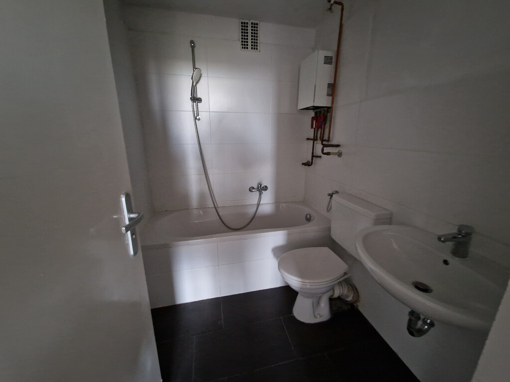 - Anthrazite Boden- und weiße Wandfliesen im Bad