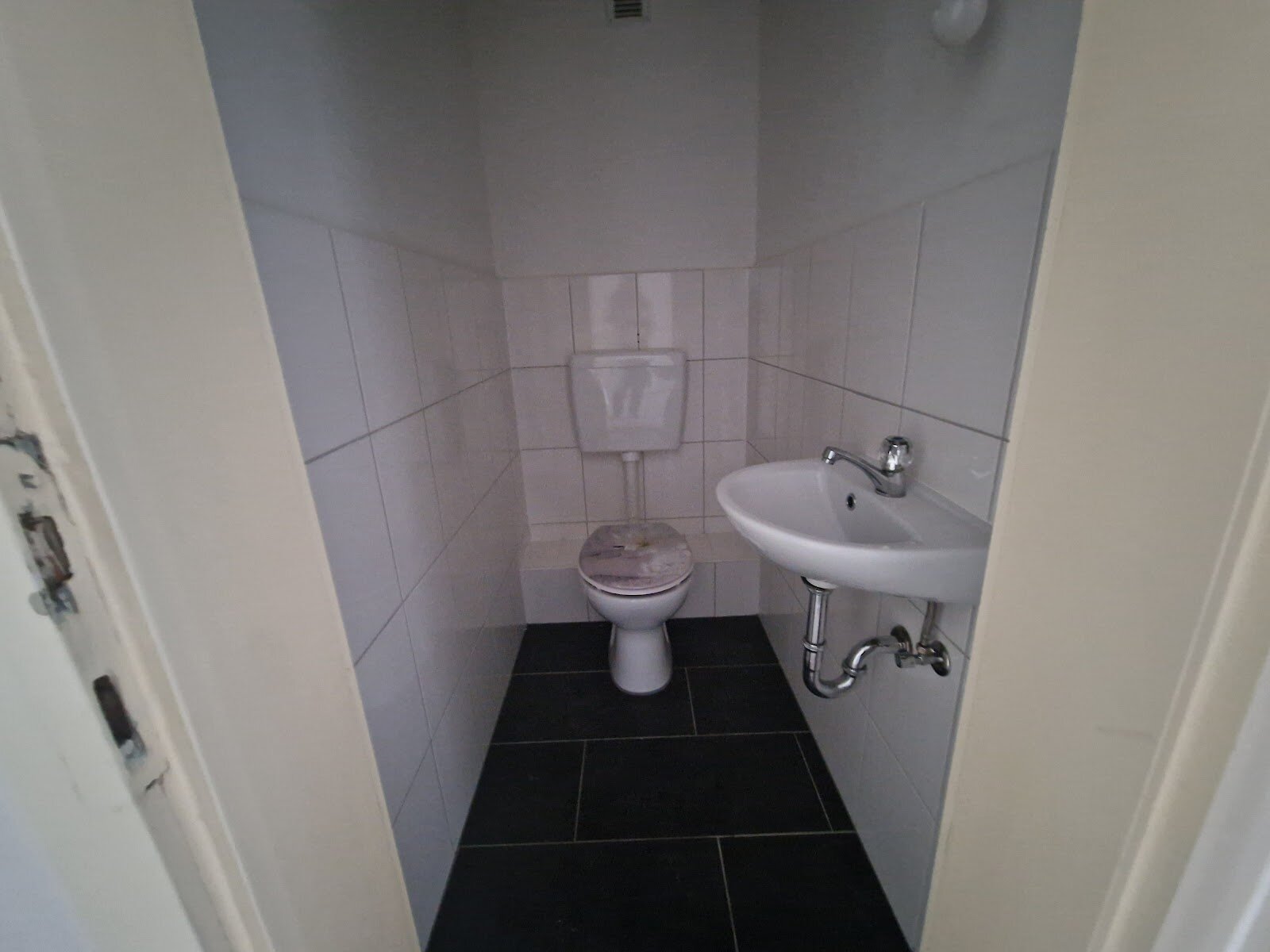 - Anthrazite Boden- und weiße Wandfliesen im Bad
