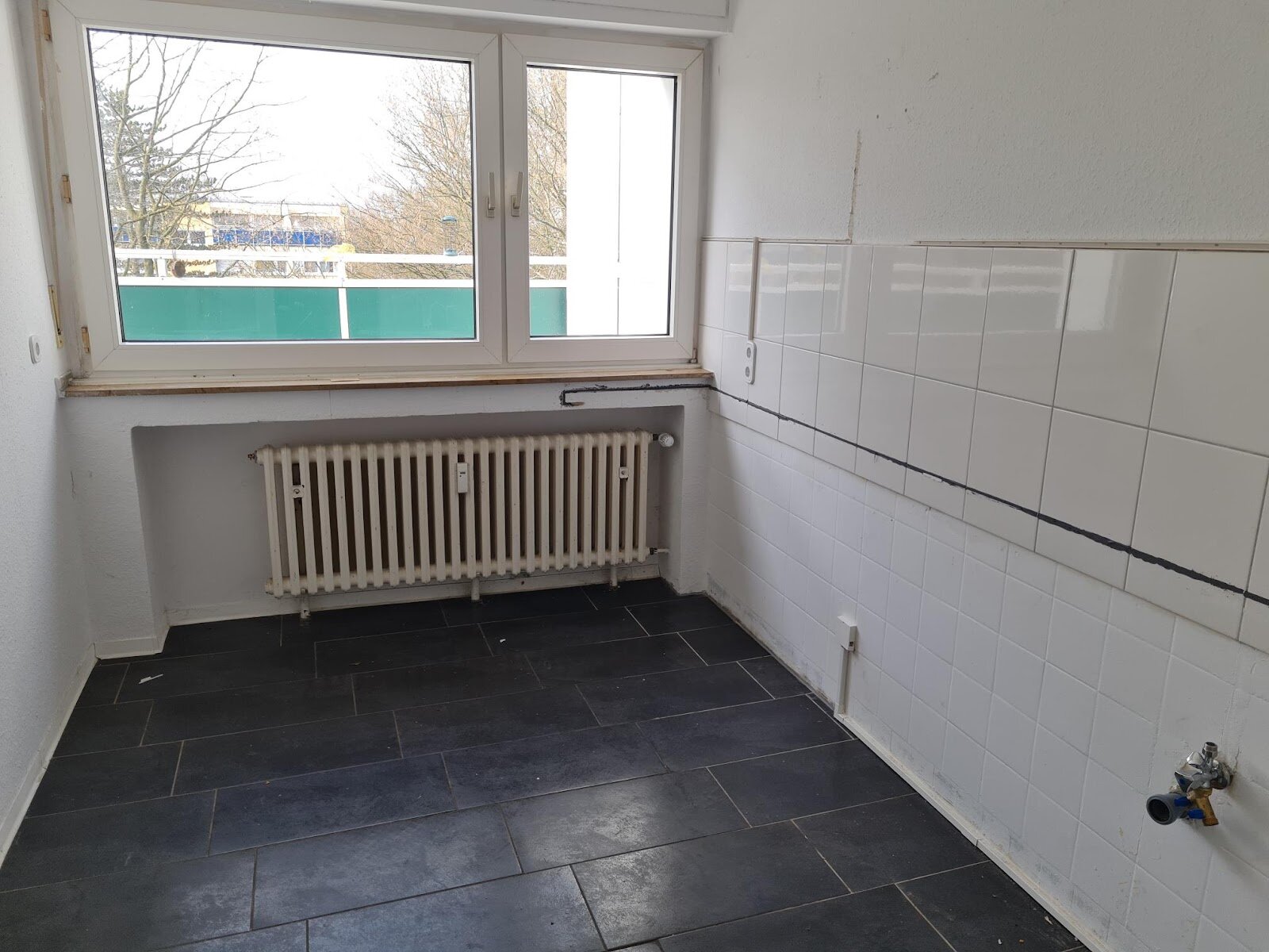 - Anthrazite Boden- und weiße Wandfliesen in der Küche