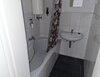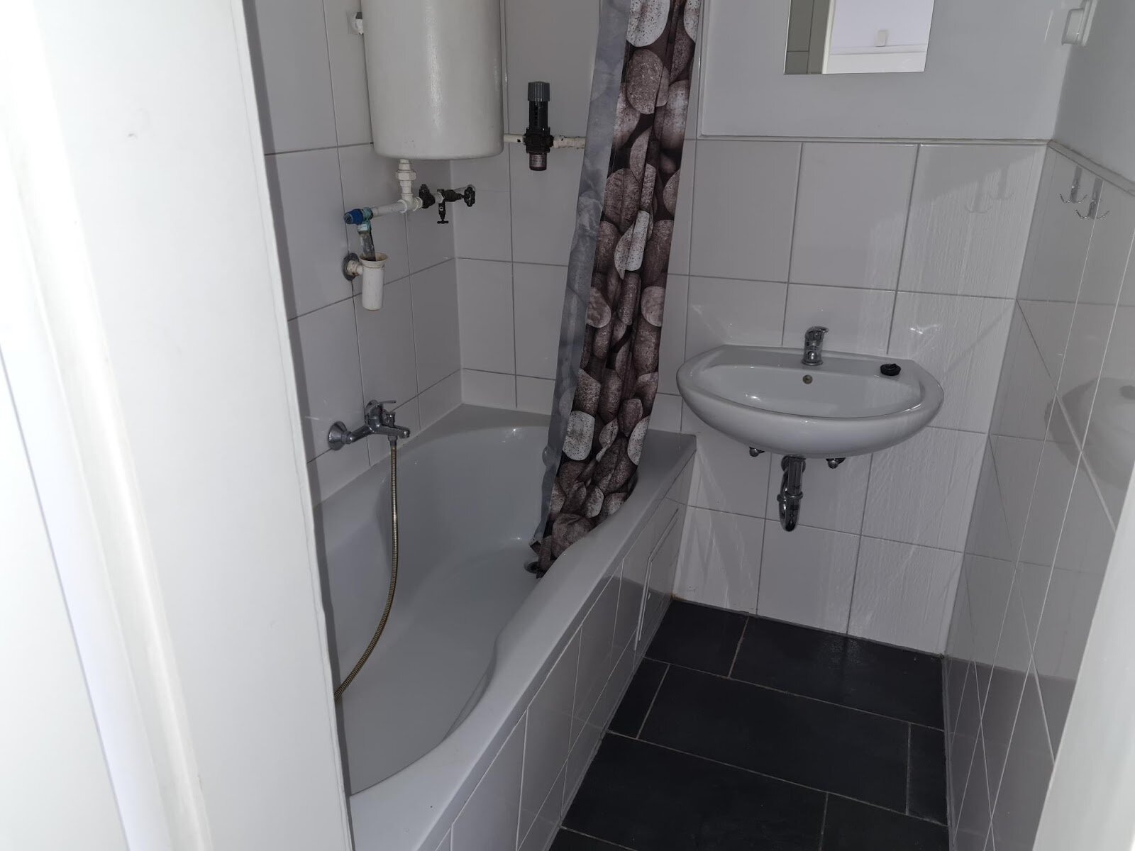 - Anthrazite Boden- und weiße Wandfliesen im Bad