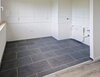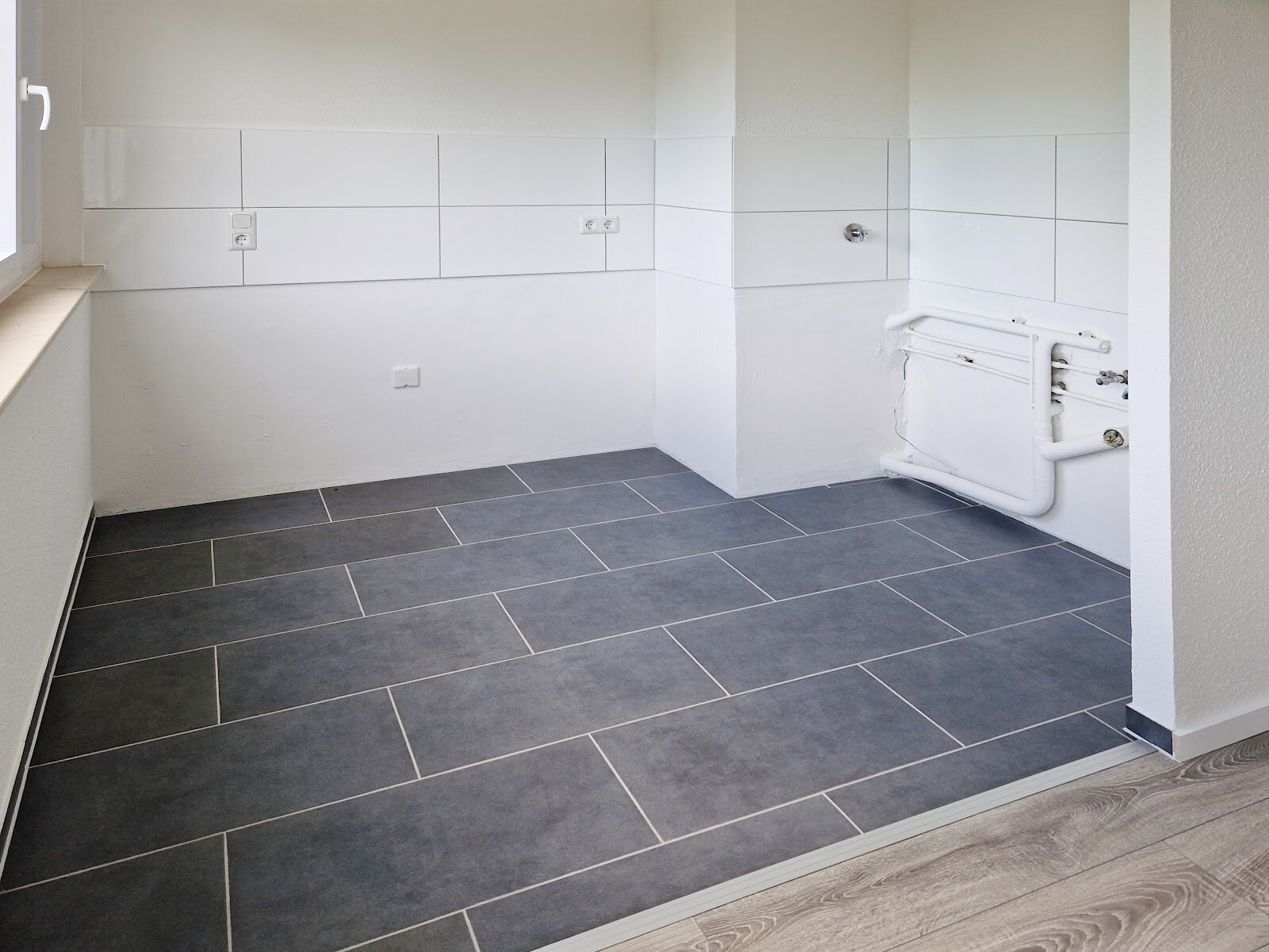 - Anthrazite Boden- und weiße Wandfliesen in der Küche