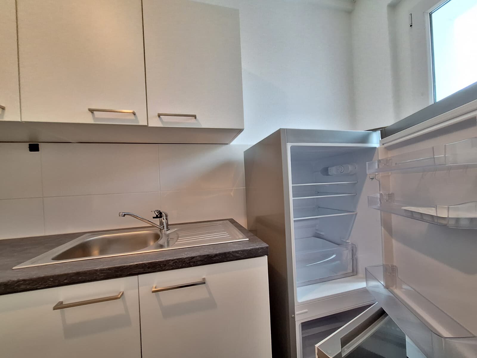 - Anthrazite Boden- und weiße Wandfliesen in der Küche