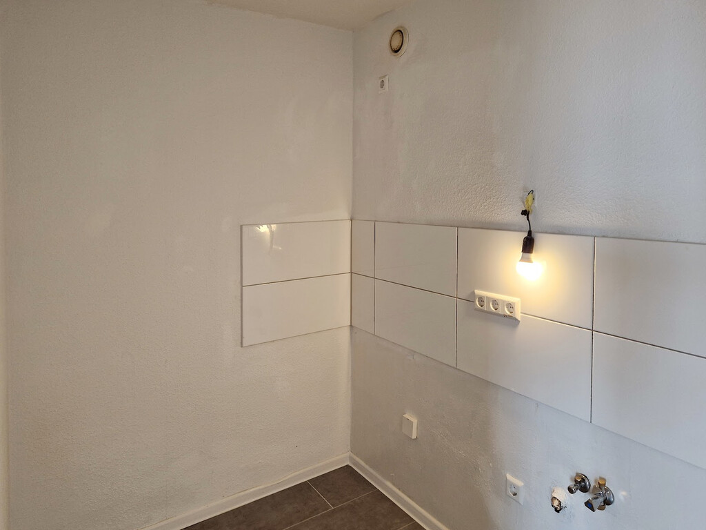 - Anthrazite Boden- und weiße Wandfliesen in der Küche