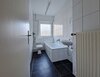 - Anthrazite Boden- und weiße Wandfliesen im Bad