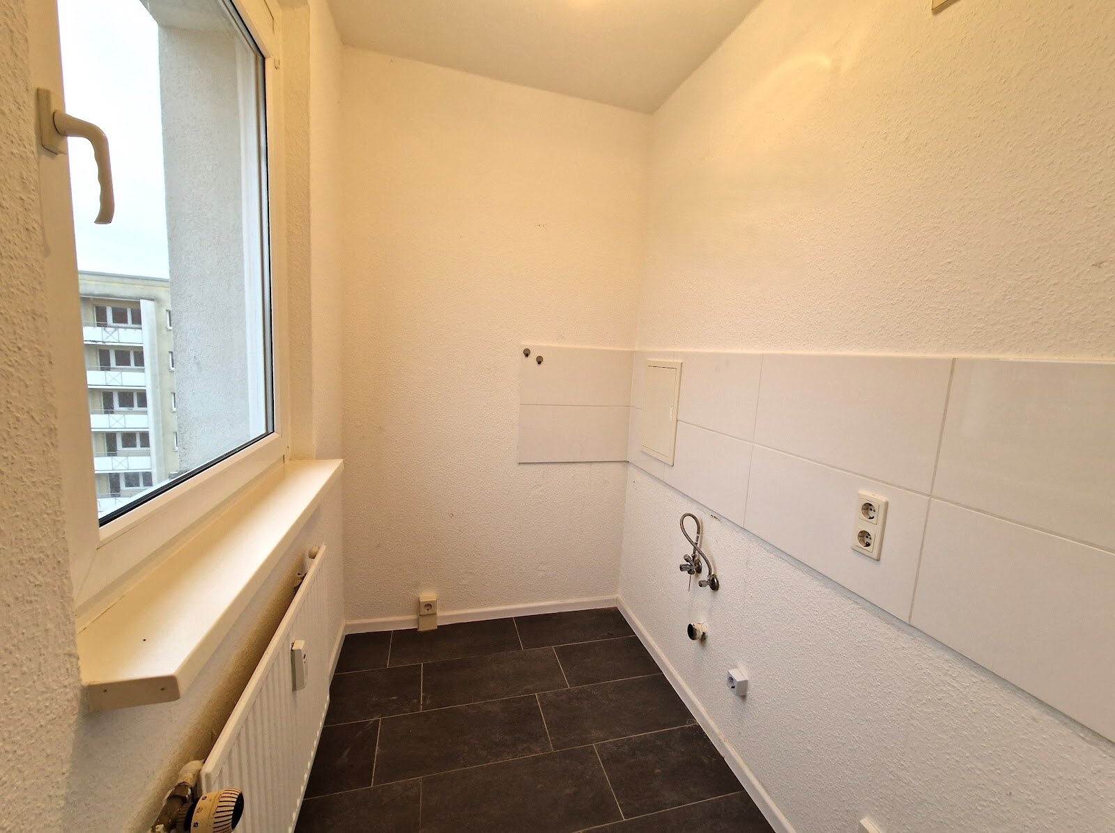 - Anthrazite Boden- und weiße Wandfliesen in der Küche