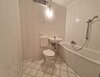 - Weiße Boden- und Wandfliesen im Bad