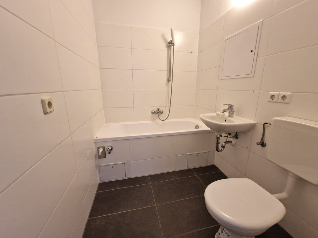 - Anthrazite Boden- und weiße Wandfliesen im Bad