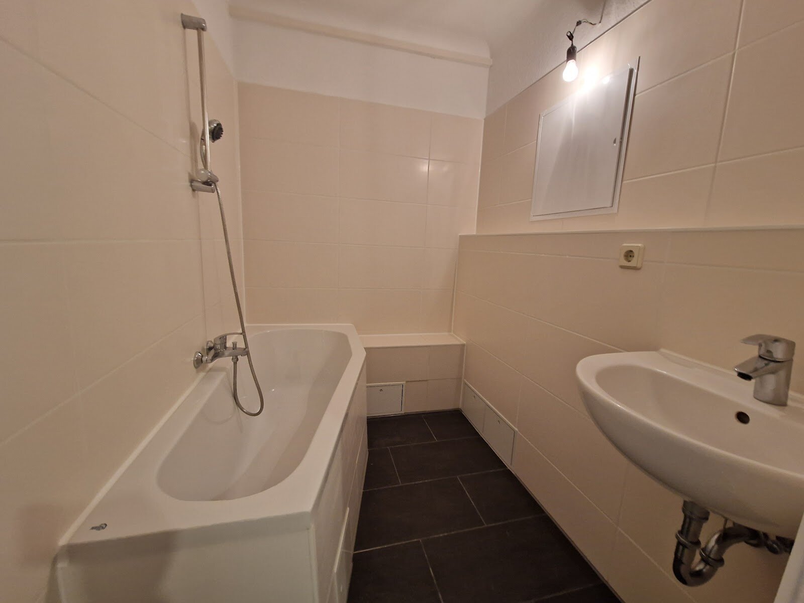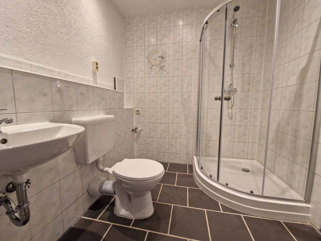 - Anthrazite Boden- und weiße Wandfliesen in beiden Bädern