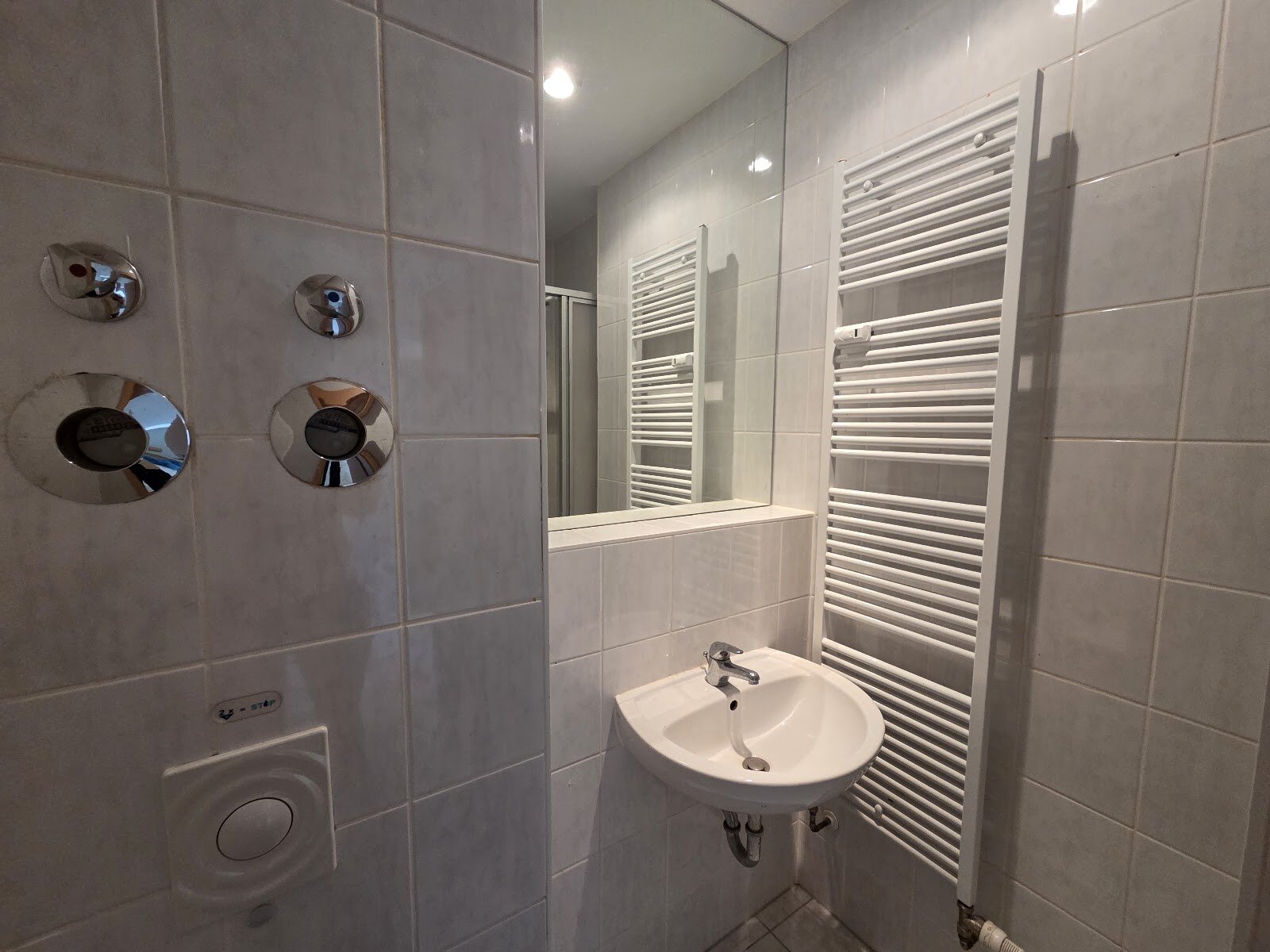 - Anthrazite Boden- und weiße Wandfliesen im Bad