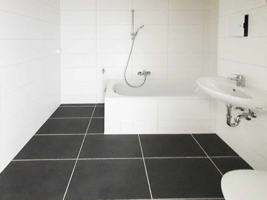 - Anthrazite Boden- und weiße Wandfliesen im Bad