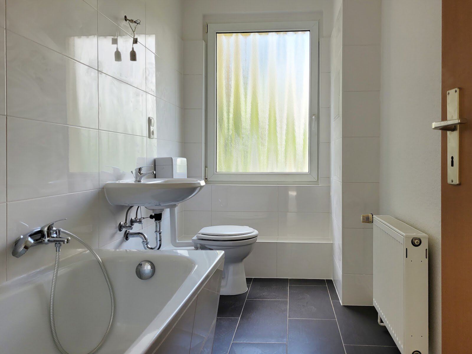 - Anthrazite Boden- und weiße Wandfliesen im Bad