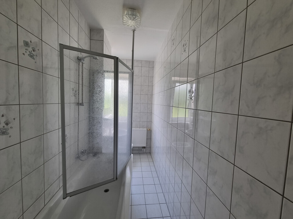 - Weiße Boden- und weiße Wandfliesen im Bad