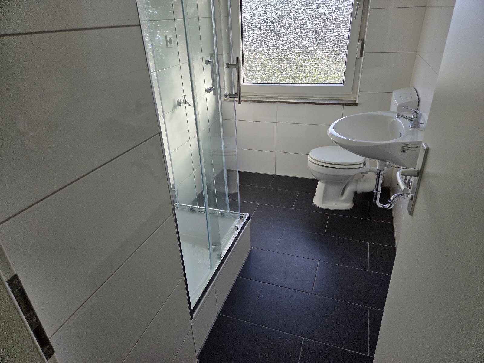 - Anthrazite Boden- und weiße Wandfliesen im Bad