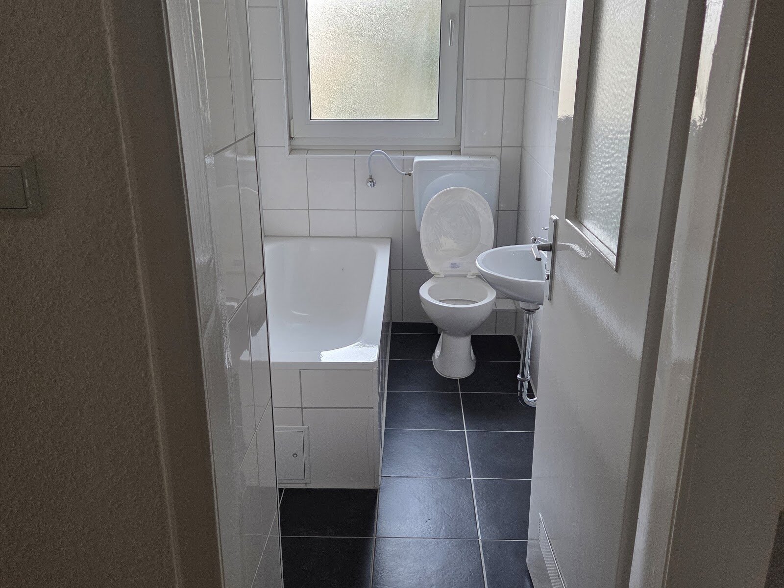 - Anthrazite Boden- und weiße Wandfliesen im Bad