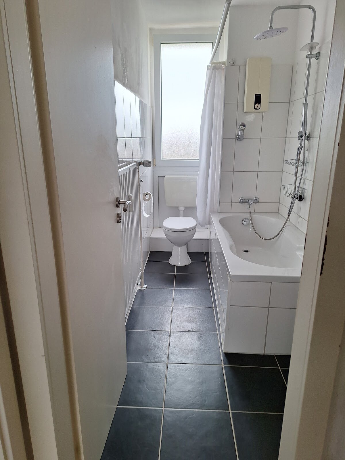 - Anthrazite Boden- und weiße Wandfliesen im Bad