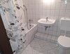 - Hellgraue Boden- und weiße Wandfliesen im Bad