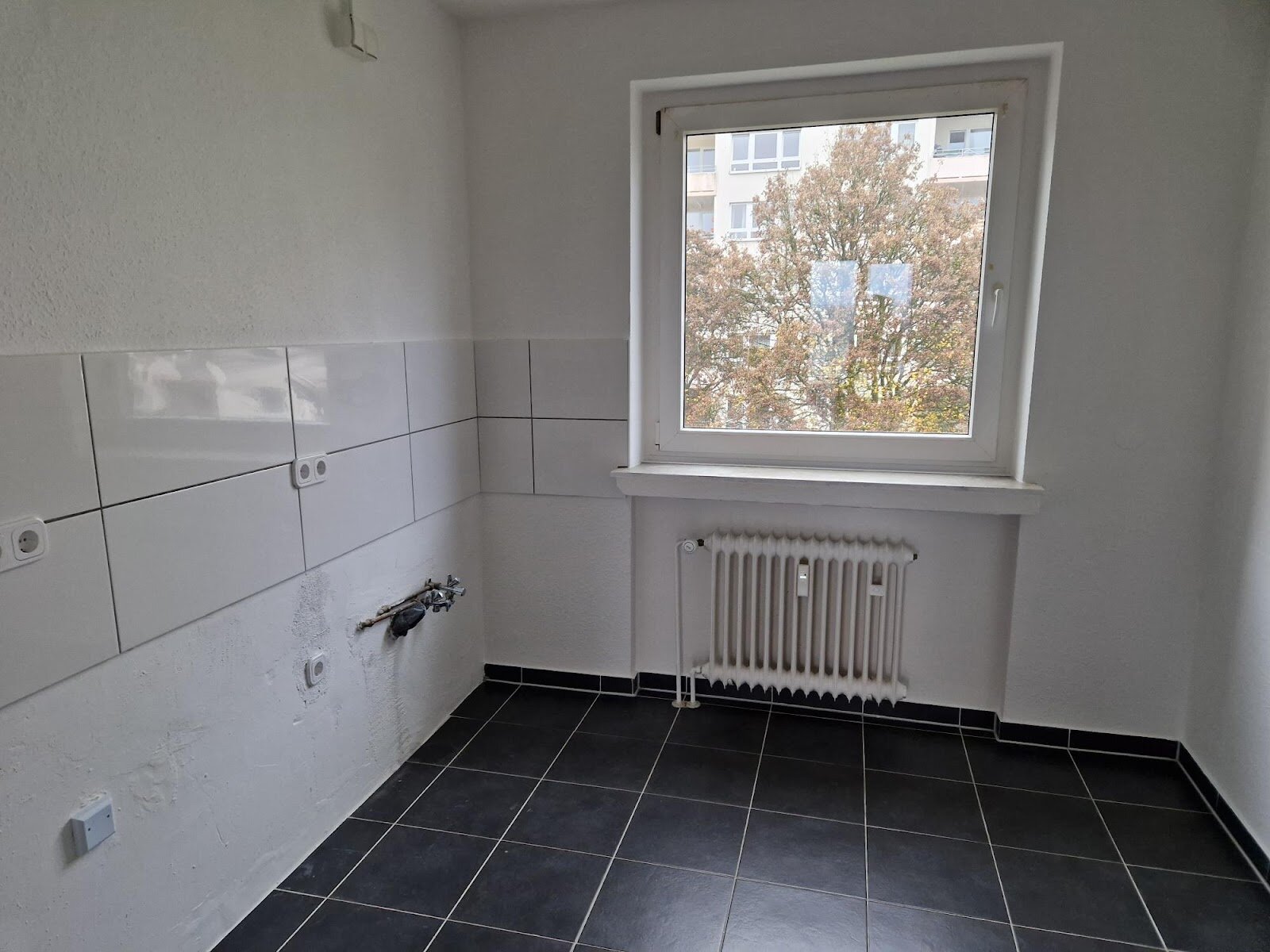 - Anthrazite Boden- und weiße Wandfliesen in der Küche